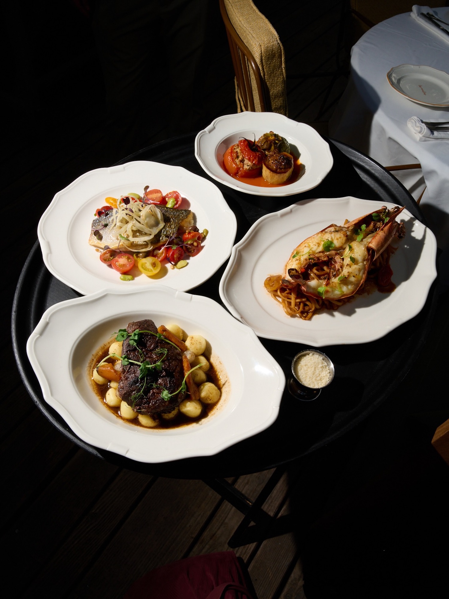 For dinner, the new menu at Les Moulins de Ramatuelle showcases the refined Provençal cuisine that enchants the finest summer tables. In a warm and elegant atmosphere, barbecued prawns, lamb chops with fennel, vegetable stuffing and other seasonal delights are served in a magical setting.