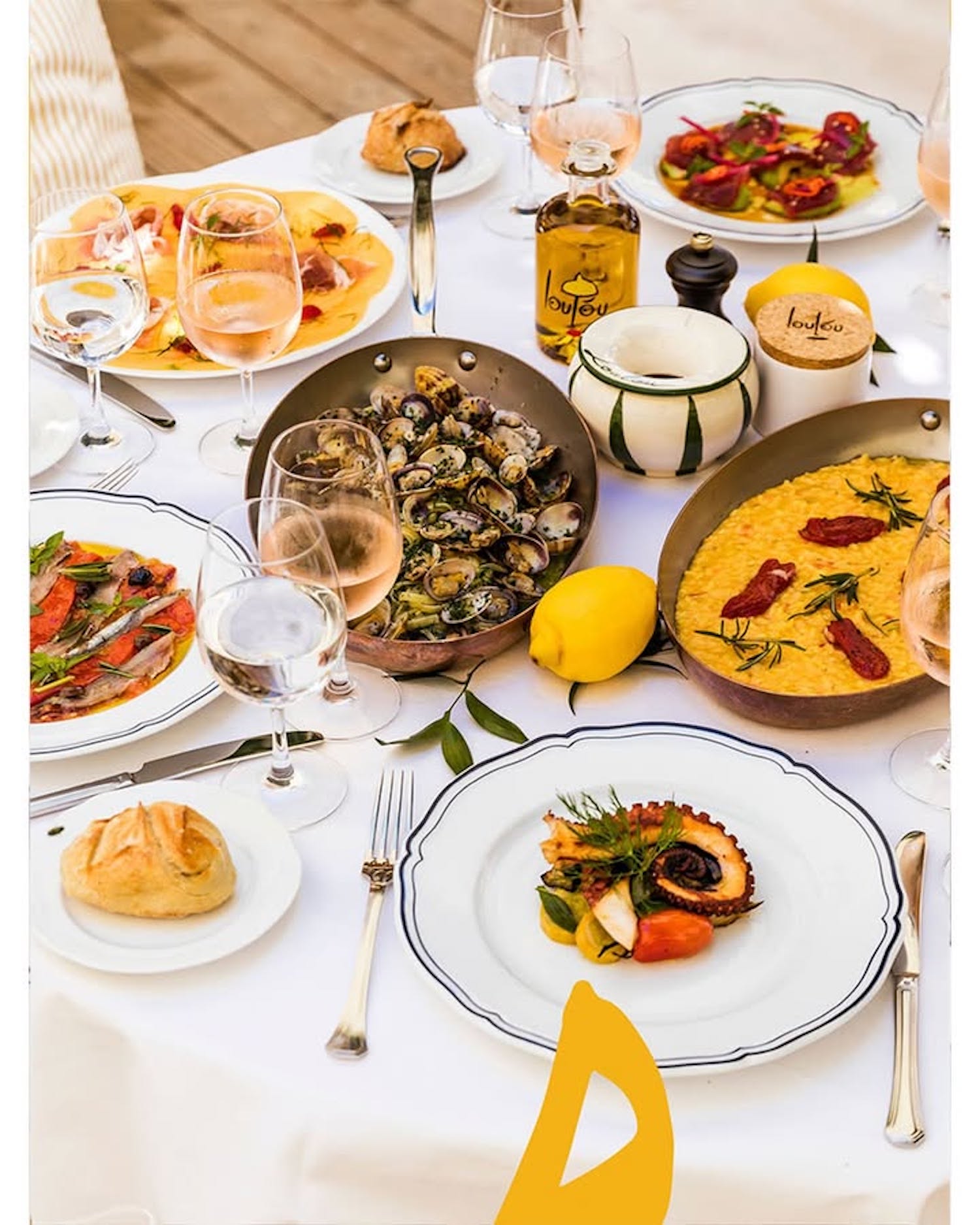 La cuisine met à l’honneur des saveurs françaises et italiennes, avec une carte ensoleillée composée de produits frais et de saison : poissons grillés, légumes, pâtes et plats à partager. L’expérience se veut conviviale et gourmande, dans un esprit chic mais décontracté.